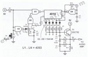 In many cases, a doorbell that sounds off a musical tone is preferable over the common buzz sound. This featured circuit is a musical doorbell. After the button S1 is pressed, a short melody is played. When the button is pressed many times in rapid succession or pressed longer, a different melody is generated and the melody plays longer.The circuit works this way: when the button S1 is activated the inputs of U3 and one input of U1 switches to logic “0″. The data input (pin 7 of IC 4015) becomes logic “1″. The 4015 is a static 4-bit shift register. Each clock impulse coming from U4 shifts this logic “1″ further in the register. The clock frequency is around 5 Hz.