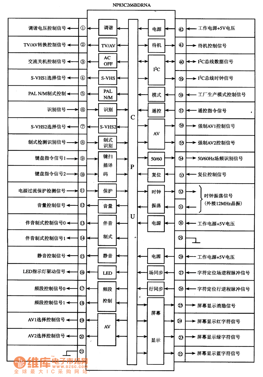 1.function featuresNP83C266BDRNA consists of the CPU, clock oscillating circuit, reset control circuit, key pulse generating circuit, key order decoding circuit, remote order signal process circuit, I2C general control circuit, system control circuit, screen displayed letter generating and processing circuit and other control and additional functions circuits, etc.2.pin functions and data