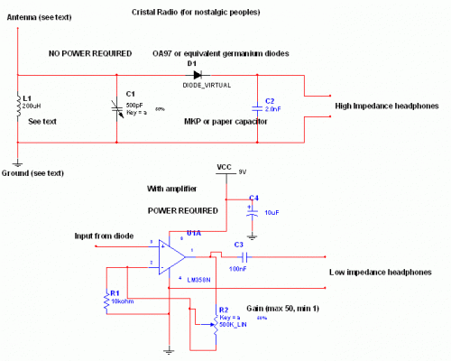 It was the first circuit i started with, and it can be build with really junk items. Apart from the diode (which replacement would need a PbS, Lead Sulphyde, galena cristal) everything you can see in the circuit (for the no power version) can be built with enamel wire, alluminium cooking foil, carton wax and so on. The real painful part is to find a high impedance headphone, it is unlikely yo find one at present day but it is possible. In addition I substituted an high internal impedance headphone with a opamp and normalheadphone but doing so you need power. Anyway if you are lucky you can find such a headphone.