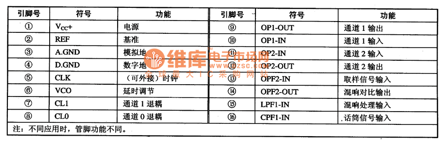 1.function featuresPT2399 includes the sampling signal process circuit, reverberation comparing process circuit, microphone signal process circuit, clock oscillating circuit, digital reverberation preset amplifier circuit, reference power supply voltage circuit, power supply stable circuit, reverberation delay circuit and other additional function circuits, etc.2.pin functions and dataPT2399 is in 16-pin dual in-line plastic package, whose pin functions are listed in the table, and its working parameters are listed in the table.The pin functions of PT2399