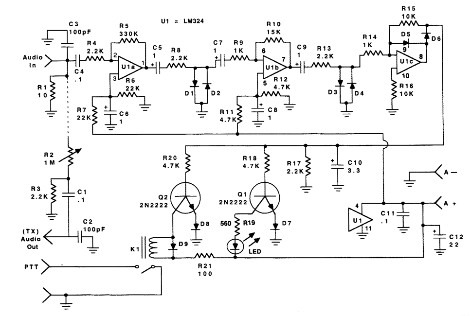 This system will key a transmitter or other device that can be keyed by a relay closure. Audio is amplified, limited, and is rectified and drives relay driver Q2 and LED indicator. The transmitter au-dio output was used to feed a keyed transmitter and can be deleted or ignored where this feature is unnecessary.