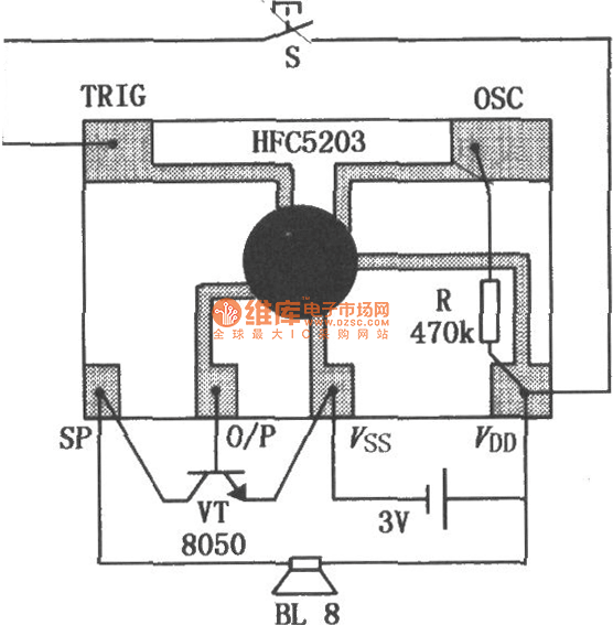 HFC5203A is large-scale CMOS integrated circuit, storing a female voice please close the door . The pronunciation is clear and the peripheral circuit is simple. With level and do-not-keep- triggering mode, it can be widely used in banks, stores, security departments, air conditioning rooms and electric refrigerators to give reminders. The typical application circuit of HFC5203A is as shown in the figure.