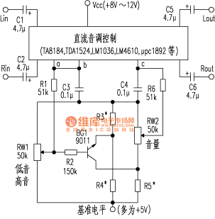 The core parts of the circuit by a dc tone control IC, a NPN transistor, and four resistors common enough. Other components are used in the dc tone control IC itself needs to peripheral components. Most dc tone control IC has himself to dc tone control circuit provides a reference level (mostly + 5 v), but mu PC1892 dc tone control IC, such as exception, must by external with + 5 v dc reference level. Figure 1 for this function circuit schematic diagram, figure 2 as an example.