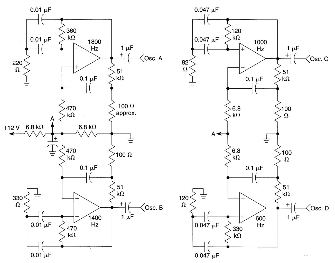 A quad op amp (TL084, etc.) can be used to produce four audio tone generators for use in a test setup. The circuit uses a 12-V supply.