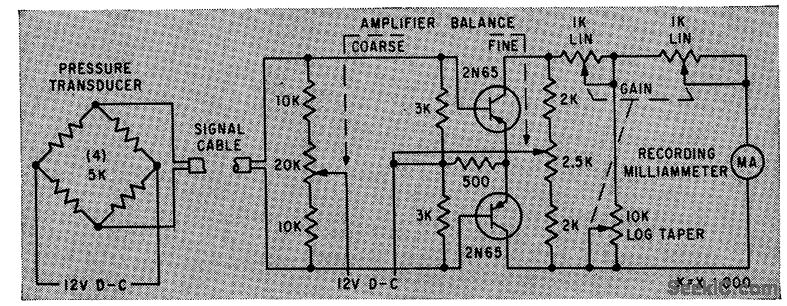 Can drive low-impedance recording galvanometer for long periods without auxiliary power. Bilateral symmetry of push-pull circuit using matched 2N65 transistors optimizes linearity and thermal stability. Although designed for d-c operation, response is fiat within 2 db up to 50 kc.-W. G. Von Dom, Transistor D.C Amplifier for Rugged Use in Field, Electronics, 33:1, p 85.