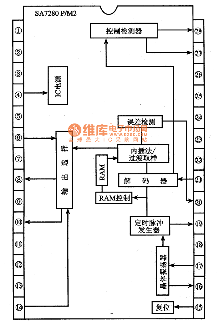SA7280P/M2 is the NICAM decoding integrated circuit produced by Philips, which is often used in large screen color TV.SA7280P/M2 is in 28-pin dual line package, whose internal circuit is shown in the figure, and its pin functions and data are listed in the table, for reference.