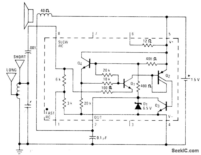 National LM3909 IC is connected as detector-amplifier driving loud-speaker, with extremely low power gain giving continuous operation for 1 month from D cell. Tuning capability is comparable to that of simple crystal set. Provides acceptable volume from local station if used with efficient 6-inch 40-ohm loudspeaker. Coil is standard AM radio ferrite loopstick having tap 40% of turns from one end. Short antenna can be 10-20 feet, and long antenna can be 30-100 feet.- Linear Applications, Vol. 2, National Semiconductor, Santa Clara, CA, 1976, AN-154, p 8-9.