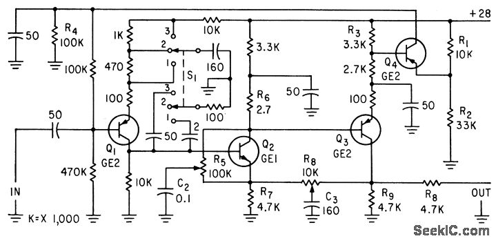 Switch gives choice of input impedance, frequency response, and level-compensation network. R5 is tone control. Q4 Provides biascurrent to base of Q1 for stabilization-H.W. Parmer, Two Easy Ways to Stabilize Power -Transistor Hi-fi Amplifiers, Electronics,35:43,p 56-58.