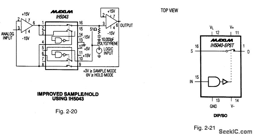 Figures 2-20 and 2-21 show a typical application circuit and pin configuration/ switching-state, respectively, for the IH5040-IH5045/47. These general-purpose CMOS analog switches are latch-up proof, with 1-nA leakage current and less than 1-μA quiescent current. MAXIM HIGH-RELIABILITY DATA BOOK, 1993, P. 1-153.