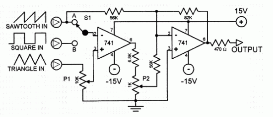 This sawtooth generator circuit use 741 IC and is used as a musical sound synthesizer. The sawtooth input signal is continously changed through P2 to a waveform with a doubled frequency and half amplitude. IC1 functions as a comparator and forms the sawtooth to a squarewave signal. IC2 serves as a adder.The input signal and the converted signal are mixed to create the output signal. An additional LFO pulsewidth modulated the squarewave to give the output sound the desired effect. When switch S1 is switched to position B, the squarewave can be mixed with a freq. which is independent from the sawtooth.The current consumption is around 10 mA.