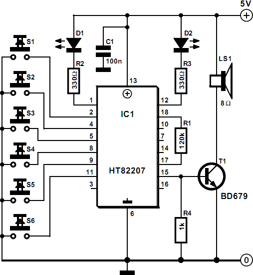 This sound generator circuit will produce 6 sound effects from the old west and it shows how far integration can be taken: IC1, a Type HT82207 from Holtek does virtually everything. Only a (small) loudspeaker and the necessary selectors need to be added.The standard 18-pin Type HT82207 is an integrated sound generator, producing sounds typical of the Old West. The various sounds are selected by S1 – S6 as listed below. In the quiescent state, the circuit draws a current not exceeding 1 μA.
