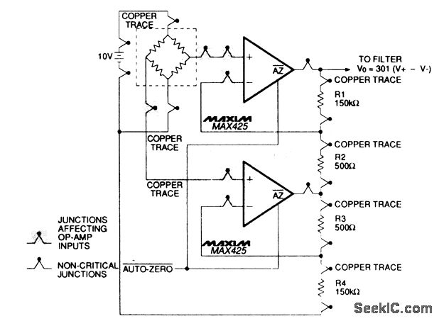 This circuit shows the previous strain-gauge example (Fig. 1-11) with low-level nodes highlighted and shown as thermoelectric junctions. An even number of connections cancels the errors as long as no temperature gradients appear across the circuit. Such gradients are best prevented by symmetric PC layouts with traces sized for matched thermal conductivity. In extreme cases, the circuitry can also be insulated from external heat sources and drafts.