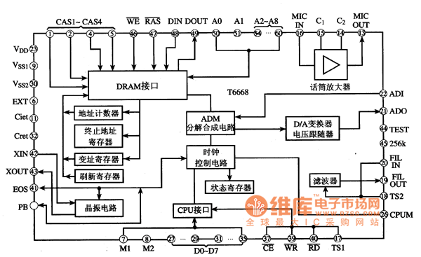1. Function featuresThe internal circuit of T6668 consists of the microphone amplifier that is formed by CMOS backward amplifiers, the ADM separation/compound circuit which is responding to analog signal separation and digital signal compounding and D/A converting circuit; the clock that provide with address and control signal, counter and D/A (dynamic storage) connector, and portable transformer and band-pass filter which are used to improve the sound quality; the CPU connector for connecting computers conveniently, and other additional function circuits,etc.