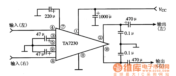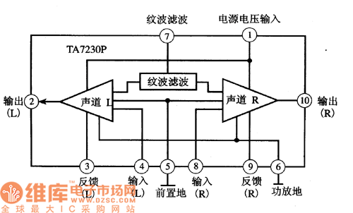 TA7230 is the dual channel audio power amplifier integrated circuit produced by Toshiba, which is widely used in stereo systems, such as car stereos, domestic stereos and so on.1.function features TA7230 contains 2 lines of same-function audio power amplifier circuits, wave filtering circuit, and the silence/mute circuit of power supply protection, whose pin functions are shown in Figure 1. Figure1. The internal circuit of TA7230