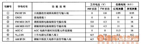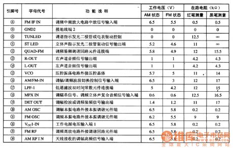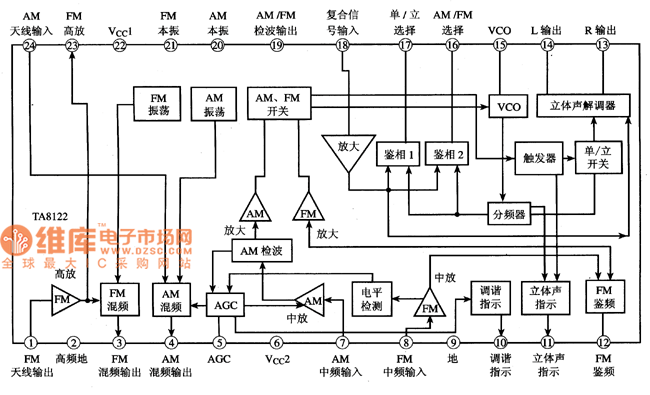 TA8122AN/AF is the single chip reception integrated circuit produced by Toshiba, which is used in all kinds of stereo reproducing circuits, such as car stereo and domestic stereos, etc.1.function featuresTA8122AN/AF contains AM modulation mixing, self-oscillation, INTREQ, detection circuit; FM AGC, mixing, self-oscillating, INTREQ, detection, stereo decoding circuit, etc; the additional circuits includes the display drive circuit, stereo ordering drive circuit, AM/FM shifting electric switch circuit, etc. The internal circuit of TA8122AN/AF is shown in Figure 1.