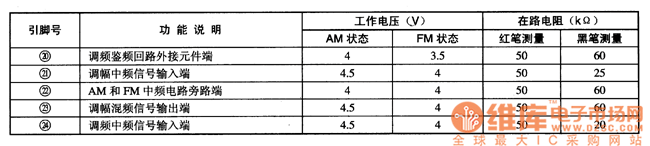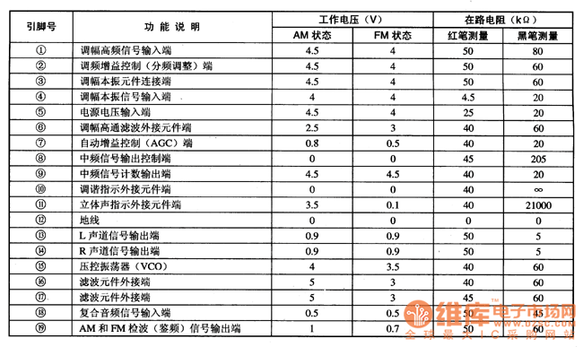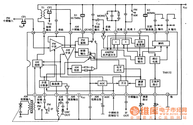 1.function featuresTA8132 contains AM mixing, AGC, INTREQ and detection circuit; it also contains FM INTREQ, frequency discrimination and stereo circuit. In addition, it has the functions as follows. FM/AM output point(9-pin) can provide with auto stop signal of counting modulation for the digital channel selecting modulation system. AM INTREQ counting frequency is 465KHZ; and the FM INTREQ counting frequency can be 10.7MHz, and according to the need, it can be replaced by 1.3375MHz by starting the 1/8 distribution circuit of IC .2.pin functions and data
