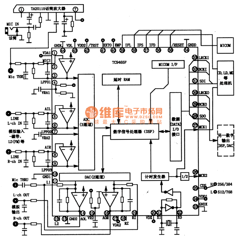 The TC9465F Manifold-circuit has three analog channels and a digital stereo input port and two simulation and output ports; the DAC using the Σ-△ modulation and oversampling mode; the built-channel ADC is the pre-filter amplifier with the 64Kbit delay RAM and the digital signal processor (DSP).etc.