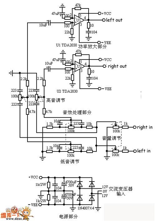 The following circuit is a high-fidelity active speaker circuit designed with TDA2030. Dual power supply is adopted, as well as high and low tone and volume control. When designing PCB, it is suggested not trying to set the ground through the device’s pin. Therefore, the current noise can be reduced.