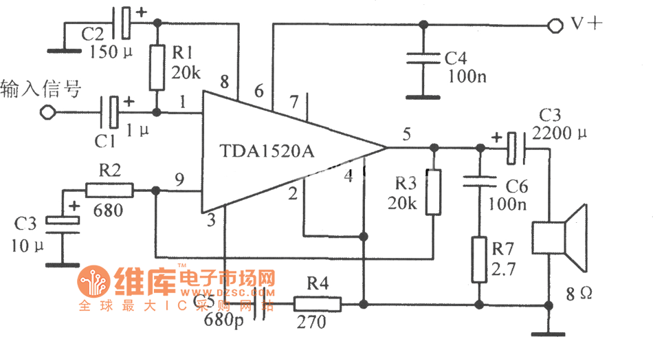Published:2014/2/9 21:02:00 Author: | Keyword: TDAl520A typical application circuit diagram, | From:SeekIC
