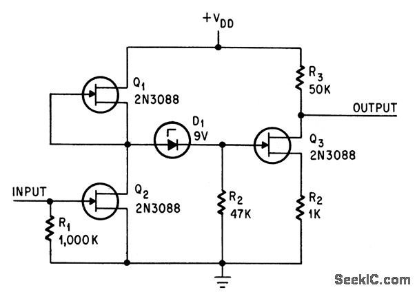 Gives high audio voltage gain (40 db), high impedance, low-noise operation, and good temperature stability with low supply voltage. Q3 serves as loadresistance.-B. Smith, Low-Noise FETs Sound Good To Circuit Designers, Electronics,37:31, p 58-62.