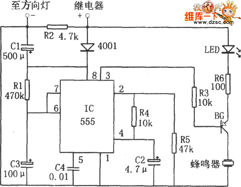 When the light is on, the power supply from the direction light relay is imposed on 555 8-pin, which makes the capacitor C3 charges by R1. As the charging is going on, the LEV on 6-pin is rising, when the LEV reaches 2/3VDD (after it is delayed about 1min), the 555 is reversing, 3-pin outputs a low LEV to make BG conducting. Then the LED is driven to glow, the buzzer is ringing, and the photo-sound reminds the driver of turning off the light quickly. The time of lighting, which is corresponding to the delayed time in the circuit, can be changed by adjusting the time constant R1C3.