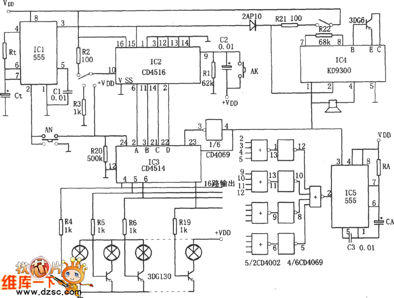 The circuit consists of the 555 single stable time delay circuit, a counter IC2, a decoding displayer IC3, a delay stereo circuit and so on. The single stable circuit consists of 555, Rt, Ct and so on, it's delayed time is td1=1.1RtCt. The counter can preset a 4-bit binary reversible counter CD4516. IC3 is a 4-bit lock-storage 4-16 line decoder. The stereo circuit consists of the music integrated circuit IC4(KD9300) and the loudspeaker. When the switch AN is pressed, the delaying pulse, which is output by IC1, is added on the counter IC2, and IC2 does the +1(or -1) counting, and the output of Q1~Q4 comes into IC3 for decoding.