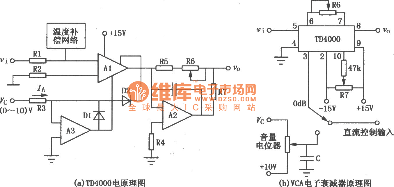 The VCA electronic attenuation circuit is shown in the figure (b), it is an application. When the VCA is used as the electronic attenuator, it's features are better than the mechanical attenuator of the chinese broadcasting system, because it does not has the slip noise, easy to control and the attenuation change is continuous. When you adjust the volume manually, the volume potentiometer only need to use the linear potentiometer with Bell characteristics, even if there is noise in the process of using, you can clear the noise by filter.