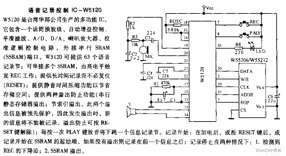 W5120 is a multifunctional IC produced by Taiwan's Winbond Company. It contains a microphone top-level, automatic gain control, smoothing filter, A / D, D / A, speaker amplifier, calibration logic control point and external Serial SRAM (SSRAM) port. W5120 provides 63 voice recording sections. It can cascade multiple SSRAM, whose high level triggers the REC to work. And it provides long records without needs to reset (RESET). Quiet time compression is provided to save storage space. Besides, two overflow prevention functions are equipped (Serial SRAM is easy to overflow and so is the section index.)