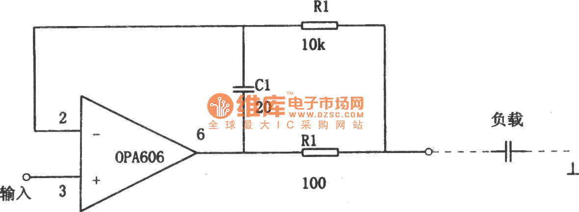 The picture shows the buffer circuit of isolated capacitive load.The general operational amplifier will greatly effect the circuit stability,and its dynamic performance will decline seriously when it is connected to capacitive load.However,the circuit shown in picture is able to drive capacitive loads,because the circuit uses the FET input-based media isolation broadband op-amp OPA606 to form amplifier,and to idealized the load ability of amplifition circuit.