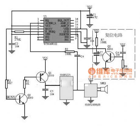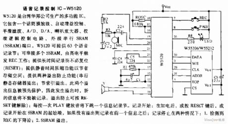 W5120 is a multifunctional IC produced by Taiwan's Winbond Company. It contains a microphone top-level, automatic gain control, smoothing filter, A / D, D / A, speaker amplifier, calibration logic control point and external Serial SRAM (SSRAM) port. W5120 provides 63 voice recording sections. It can cascade multiple SSRAM, whose high level triggers the REC to work. And it provides long records without needs to reset (RESET). Quiet time compression is provided to save storage space. Besides, two overflow prevention functions are equipped (Serial SRAM is easy to overflow and so is the section index.)