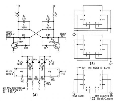Basic binary circuit can be used alone as at A for counting up to 130 kc. Two circuits connected as at B give lip-fop operation, while one circuit with external connections as in C serves as bistable gate.-K. H. Brackney und D. R. Gosch, Pulse Comparator Circuit Measures Frequency Jitter, Electronics, 34:27, p 54-56. (View)