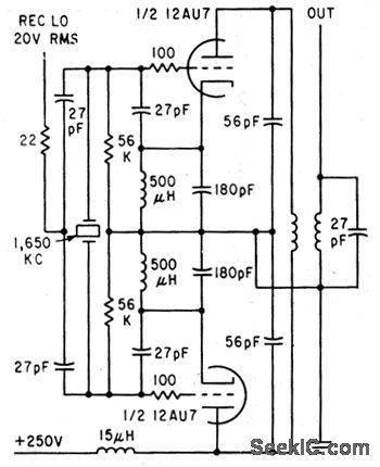 Requires only one crystal per channel in 27-Mc citizens band radiotelephones, by combining beating oscillator with balanced mixer. Receiver local oscillator with balanced mixer.Receiver local oscilator signal and even harmonics of beating oscillator frequency are cancelled in tuned symmetrical plate circuit.-M. E. Baird, Mixer Circuit Lowers Radiotelephone Costs, Electronics,34:47, p71. (View)