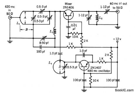 Common-base mixer is used with 480-Mc oscillator to give 60-Mc i-f output, with 10 db average conversion gain.-Texas Instruments Inc. Tran-sistor Circuit Design, McGraw-Hill, N.Y. 1963, p327. (View)