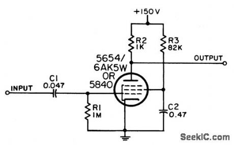 Used to amplify and limit low-level video signals. Capable of handling very fast rise times. Maximum duty factor is 4%. Limiting level is within 35% of 4.8 V, depending on variations in tube and components.-NBS, Handbook Preferred Circuits Navy Aeroncautical Electronic Equipment, Vol. 1, Electron Tube Circuits, 1963, PC 21, p 21-2. (View)