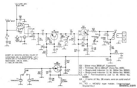 Crystal-controlled VLF converter covering 1750-meter band gives choice of two outputs, selected by S2, for communication or broadcast receiver. Tuning range is 160 to 190 kHz. Connect general-coverage receiver to IF output terminals with length of coax. -J. V. Hagan, A Crystal-Con-trolled Converter and Simple Transmitter for 1750-Meter Operation, QST, Jan. 1974, p 19-22. (View)
