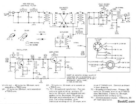 Developed for use as second converter in all-band double-conversion superheterodyne receiver for AM, narrow-band FM CW, and SSB operation. IF amplifier Q23 is followed by triple-tuned filter feeding second mixer Q24, with Q25 as crystal oscillator. Supply is 13.6 V regulated. Article gives all circuits of receiver.-D M Eisenberg, Build This All-Band VHF Receiver, 73 Magazine, Jan, 1975, p105-112 (View)