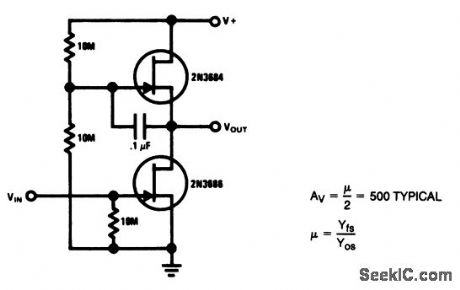 Sometimes called the JFET μ amp, this circuit provides a very low-power, high-gain amplifying function. Because μ of a JFET increases as drain current decreases, the lower drain current is, the more gain you get. However, dynamic range is sacrificed with increasing gain. (View)