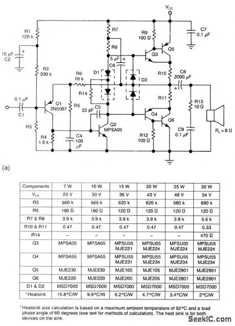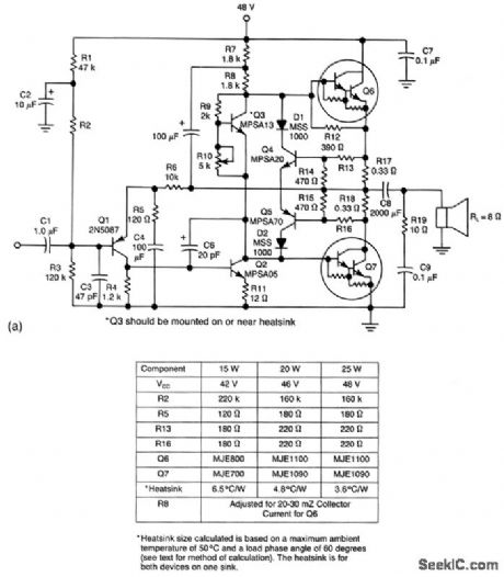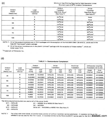 This circuit makes optimum use of economy transistors in discrete-component amplifiers that will operate safely under any usable load conditions, including shorts. Figures 1-15B, 1-15C, and 1-15D show the transistor complement, resistor values/power-supply voltages, and heatsink requirements, respectively, for various power outputs from 35 to 100 W. Input sensitivity is 1 Vrms into 10 kΩ for full-rated output power. Frequency response is less than 3-dB rolloff from 10 Hz to 100 kHz, referenced to t kHz. Power bandwidth is the full-rated output power ±2 dB from 20 Hz to 20 kHz. Figures 1- 15E and 1- 15F show the load sensitivity and power bandwidth. Total harmonic distortion (THD) is less than 0.2% at any power level between 100 mW and full-rated output and at any frequency between 20 Hz and 20 kHz. Inter modulation distortion is less than 0.2% at any power level from 100 mW to the full-rated output (60 Hz and 7 kHz mixed 4 to 1 )