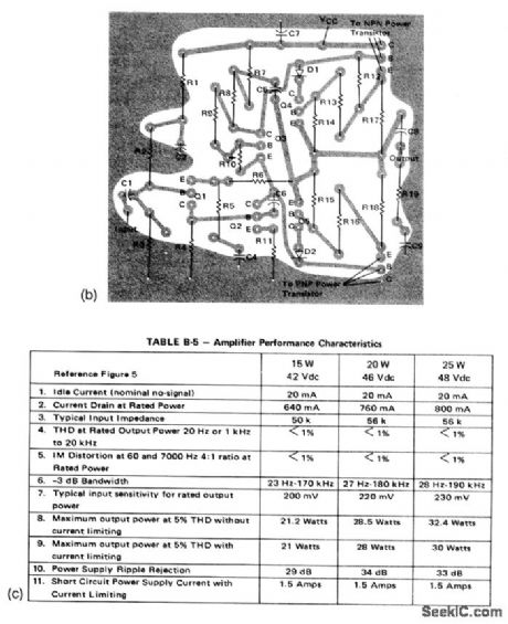 This circuit provides a 15-, 20-, or 25-W output, depending on the power source and component values (as shown), with overload protection, using Darlingtons in the output stages. Figures 1-20B and 1-20C show the PC-board layout and performance characteristics, respectively. (View)