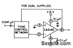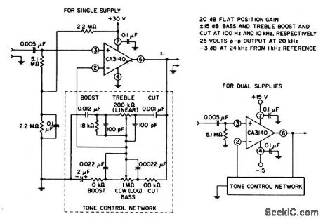 This circuit provides unity gain at midband and uses standard linear potentiometers. Bass/treble, boost, and cut are ±15 dB at 100 Hz and 10 kHz, respectively. Full peak-to-peak output is available up to at least 20 kHz. Amplifier gain is -3 dB down from the flat position (70 kHz). (View)