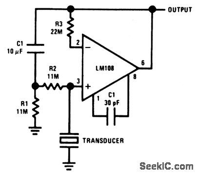 This circuit shows an LM108 amplifier for high-impedance ac transducers, such as a piezoelectric accelerometer. The circuit has input resistance that is much greater than the dc return resistor values. This is accomplished by bootstrapping the resistors to the output. With such an arrangement, the lower cutoff frequency of a capacitive transducer is determined more by the RC output of R1 and C1 than by resistor values and the equivalent capacitance of the transducer. (View)