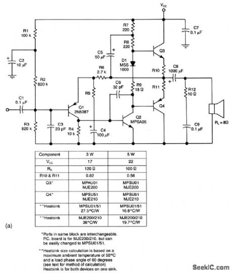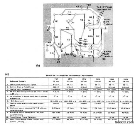 This circuit provides a 3- or 5-W output, depending on power source and component values, with an npn driver, and overload protection. Figures 1-17B and 1-17C show the PC-board layout and performance characteristics, respectiVely.