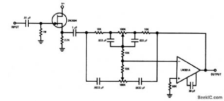The JFET provides both high input impedance and low noise to buffer an op-amp feedback-type tone control. (View)