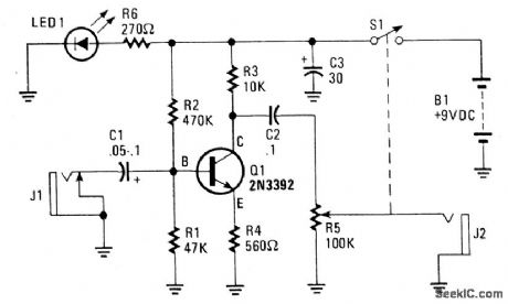 The amplifier's gain is nominally 20 dB. Its frequency response is determined primarily by the value of just a few components-primarily C1 and R1. The values of the schematic diagram provide a fesponse of ±3.0 dB from about 120 Hz to better than 20,000 Hz.Actually, the frequency response is ruler flat from about 170 Hz to well over 20,000 Hz; it's the low end that deviates from a flat frequency response. The low end's roll-off is primarily a function of capacitor C1(since RI's resistive value is fixed). If C1's value is changed to 0.1 pF, the low end's comer frequency-the frequency at which the low-end roll-off starts-is reduced to about 70 Hz. If you need an even deeper low-end roll-off, change C1 to a 1.0 pF capacitor; if it's an electrolytic type, make certain that it's installed into the circuit with the correct polarity, with the positive terminal connected to Q1's base terminal. (View)