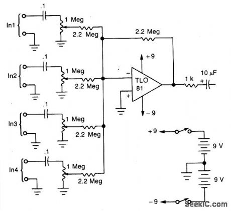 A TL081 op amp is used as a high-to-low impedance converter and signal mixer. The input impedance is approximately 1 megohm and the output impedance is about 1 kilohm. Two 9-volt batteries are used as the power source. Battery life should be several hundred hours with alkaline batteries. (View)
