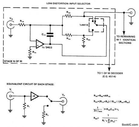 CMOS switches are used directly to select inputs in audio circuits, this can introduce unacceptable levels of distortion, but if the switch is included in the feedback network of an op amp, the distortion due to the switch can be almost eliminated. The circuit uses a 4416 CMOS switch, arranged as two independent SPDT switches. If switching transients are unimportant, R5 and C1 can be omitted, and R4 can be shorted out. However, a feedback path must be maintained, even when a channel is switched out, in order to keep the inverting input of the op amp at ground potential, and prevent excessive crosstalk between channels. (View)