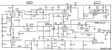 Matrixing is com pletely accomplished before detection. Can be substituted for 67-kc rejection filter of stereo demodulator. Also provides deemphasis.-L. Solomon, Multiplex Adaptors for Compatible F-M Stereo Reception, Electronics, 34:33, p 45-47. (View)