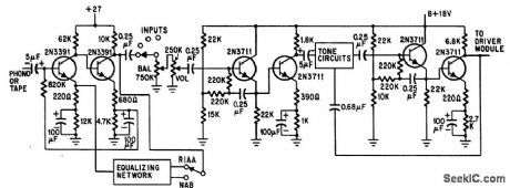 Will drive dyanamic headphones of 75 to 400 ohms impedance to power level of 60 mw. Program source may be tuner or ceramic car tridge. Frequency response is fiat within 0.33 db from 20 cps to 20 kc. High input impedance, 1 meg up to 2.5 kc and decreasing to 400K at 15 kc, is obtained by using bootstrapped bias network for Q1 along with negative feedback.- Transistor Manual, Seventh Edition, General Electric Co., 1964, p 272. (View)