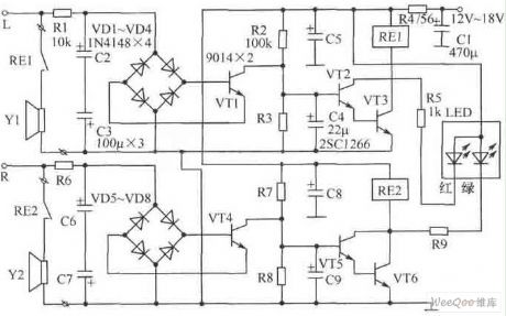 Component choice:We can choose Φ3mm high-brightness two-tone LED as LED. Because of the reason that LED has different working currents, so R5,R9 have adjustable parameters. At the same time, LED and current-limiting resistor R5,R9 are connected to relay RE1,RE2 in parallel, which can prevent inverse peak voltage and can prevent VT2,VT3,VT5,VT6 frombeing punctured. The best choice for C4,C9 is low-leakage tantalum capacitor. (View)