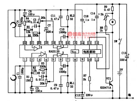 KA22135 is a single chip stereo playback integrated circuit produced by Samsung, which is used in all kinds of ultra-small radios and recorders. 1.the internal circuit and pin functions of KA22135 KA22135 contains two lines of preset amplifier circuit, power amplifier circuit and motor speed control circuit of the same function. The internal circuit and typical application circuit is shown in figure 1-1. The IC is in the flat 22-pin dual line package, and its pin functions and data are listed in table 1-1.